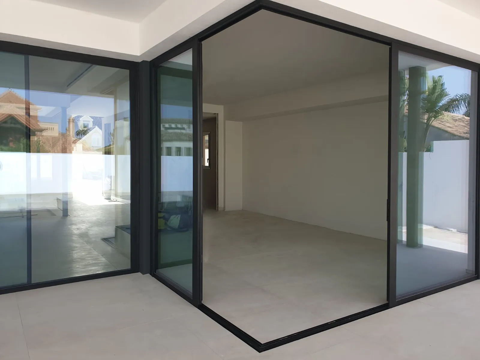 Para abordar estas necesidades, instalamos ventanas abatibles de seguridad nivel RC2, algunas de ellas de hasta 2,7 metros de altura, e incluyendo en otras la motorización para facilitar su apertura. Un fijo de 5 metros de altura ilumina el recibidor de la vivienda y las grandes correderas del salón, equipadas con vidrios de seguridad, aseguran la protección del hogar sin sacrificar el diseño y la conexión con la zona de jardín.